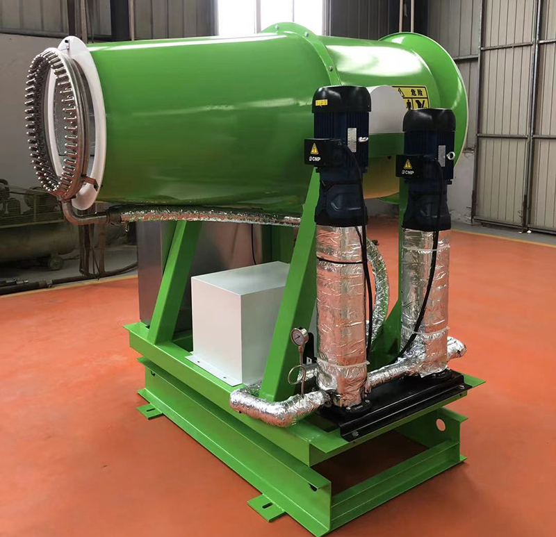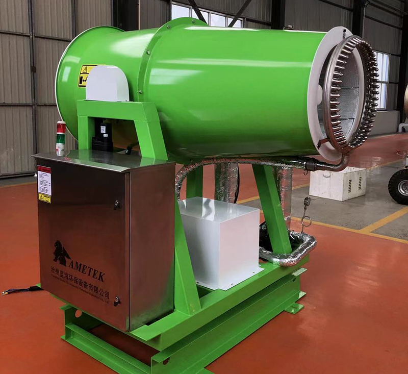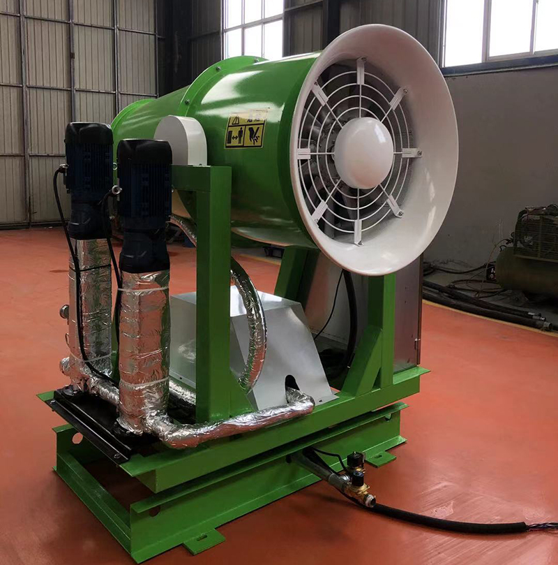 此款設備的噴霧距離是60米,配備的南方泵業(yè)的雙泵,將設備連續(xù)工作時間延長至24小時壓力能達到4Mpa,噴射出來的霧粒30微米。