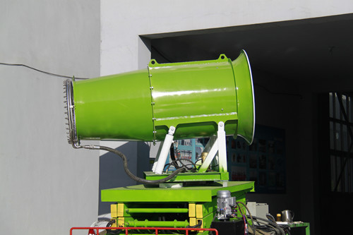 霧炮機是采用高壓水泵供水,通過水管將水送入噴霧機的噴頭處,由水泵產(chǎn)生的壓力在通過特制的噴頭將水產(chǎn)生顆粒較大的霧狀;然后由高速運轉(zhuǎn)的電動機帶動風(fēng)扇,產(chǎn)生高速流動的氣流,將水霧送出去。將顆粒較大的水霧通過高速的氣流,進一步撕裂成更細小更輕的水霧,并輸送出去。