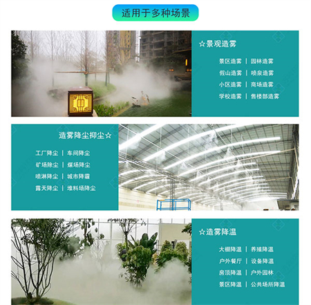 景區(qū)造霧、園林造霧、假山造霧、噴泉造霧、小區(qū)造霧、商場造霧、學校造霧、售樓部造霧。