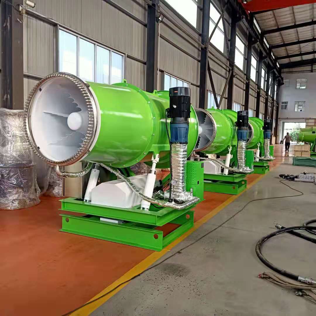 高射程噴霧器根據(jù)風(fēng)送原理,先用高壓水泵,將水通過霧化噴嘴進(jìn)行霧化,在利用風(fēng)機(jī)和風(fēng)壓將霧化的水霧噴灑到較遠(yuǎn)的距離,讓水霧在達(dá)到較遠(yuǎn)距離的同時能夠覆蓋 多的面積,等水霧和粉塵凝結(jié)后,達(dá)到降塵的目的
