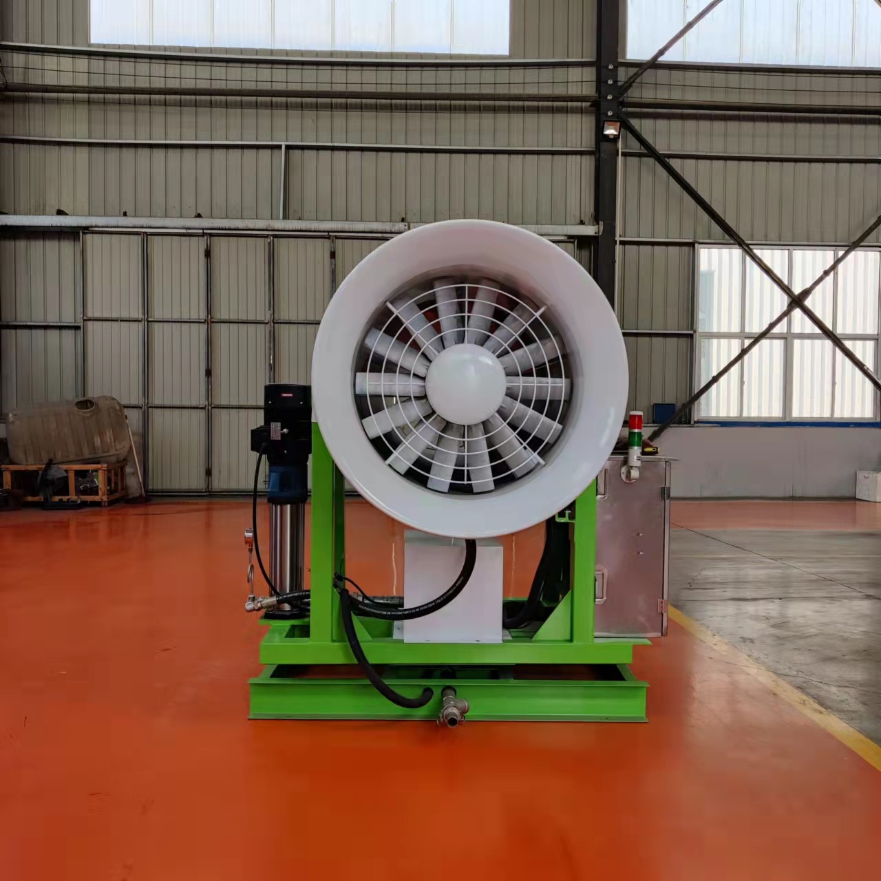 風(fēng)送式霧炮機(jī)能有 效控制粉塵,降低粉塵濃度,改 善工作環(huán)境預(yù) 防工礦事故,對(duì)促 進(jìn) 安 全生產(chǎn),保障職工身體健康,維護(hù)環(huán)境衛(wèi)生等具有重要作用。風(fēng)送式霧炮機(jī)是有葉輪、風(fēng)筒、后導(dǎo)流器、噴霧裝置以及支架等部分組成的,采用了新型葉輪,高性能后導(dǎo)流器和新型電機(jī)支持結(jié)構(gòu),風(fēng)機(jī)效率比較高,成霧也很穩(wěn)定,霧量調(diào)節(jié)范圍比較大,霧滴直徑 均勻,操作簡(jiǎn)單方便,使用壽命較長(zhǎng)。采用 的噴霧重力降塵技術(shù),通過(guò)高壓將水霧化成與粉塵大小相當(dāng)?shù)念w粒,在風(fēng)機(jī)作用下,將水霧拋射到遠(yuǎn)方,在塵源處的上方或周邊進(jìn)行噴霧覆蓋。塵埃顆粒與水珠顆粒產(chǎn)生接觸而變得濕潤(rùn),被濕潤(rùn)的粉塵顆粒繼續(xù)吸附其它粉塵顆粒,逐漸凝結(jié)成顆粒團(tuán),并在自身的重力作用下而沉降,雙而達(dá)到快速將粉塵抑制降沉的目的。該機(jī)是我廠 設(shè)計(jì),吸取國(guó)內(nèi)外 技術(shù),根據(jù) 環(huán) 保、除塵、消 毒的需求, 立設(shè)計(jì)開(kāi)發(fā)的高品質(zhì)、高技術(shù)含量的新產(chǎn)品,是解決PM2.5空氣質(zhì)量超標(biāo)的新除塵設(shè)備。