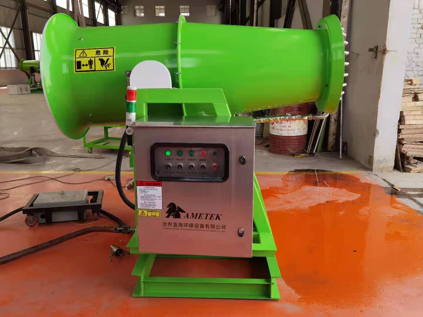 霧炮機(jī)生產(chǎn)廠家是根據(jù)風(fēng)送原理,先使用高壓泵、微細(xì)霧化噴嘴將水化,再利用風(fēng)機(jī)風(fēng)量和風(fēng)壓將霧化后的水霧送到較遠(yuǎn)距離,使得水霧到達(dá)較遠(yuǎn)距離同時能夠覆蓋 大面積,水霧與粉塵凝結(jié)后降落,從而達(dá)到降塵目的。 霧炮機(jī)對容易引起塵埃的堆場噴霧時,噴出的霧粒細(xì)小,與飄起的塵埃接觸時,形成一種潮濕霧狀粒,能快速將塵埃抑制沉降。 配套動力靈活,即可用380V的市電,也可配套發(fā)電機(jī)組供電??砂惭b在混凝土平臺或鋼架平臺上,也可安裝在運(yùn)輸車輛上。操作 ,進(jìn)口遙控器100米距離內(nèi)精 準(zhǔn)操控,遠(yuǎn)程電腦監(jiān)控。功力強(qiáng)、射程遠(yuǎn)、覆蓋范圍廣,可以實(shí)現(xiàn)定量、定時噴霧;工作效率高、噴霧速度快。耗水量相比其他抑塵噴灑設(shè)備可節(jié)約70%~80%(噴淋噴槍、灑水機(jī)車),且水霧覆蓋面積遠(yuǎn)大于其他噴灑設(shè)備。