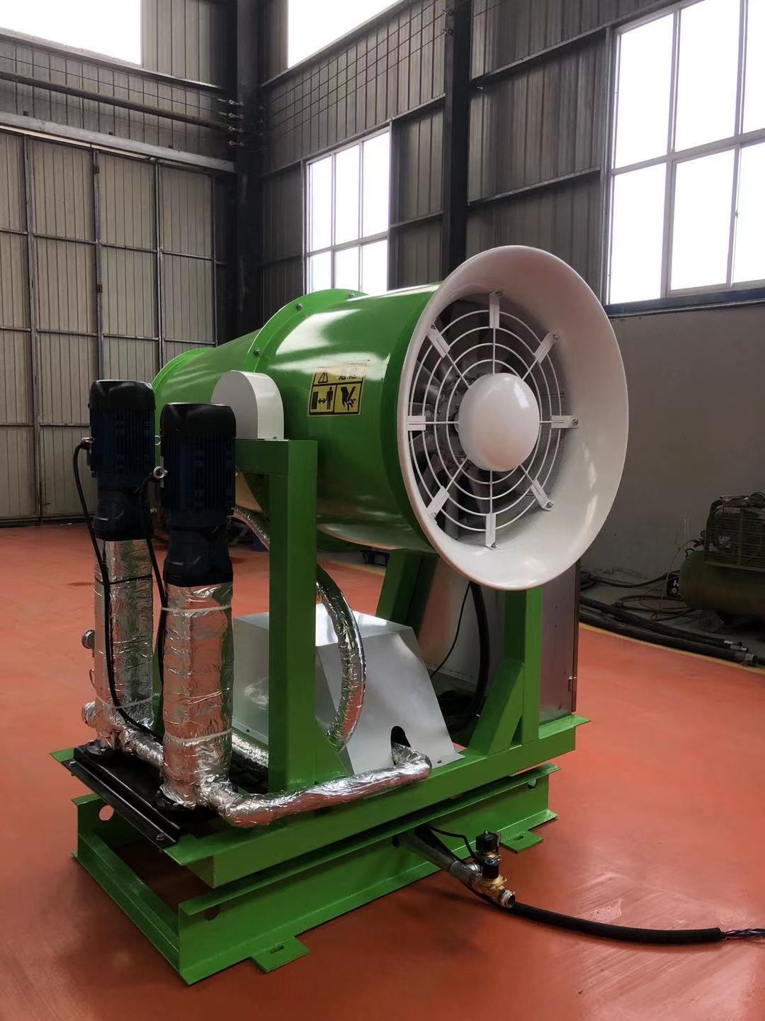 風送式霧炮機能有 效控制粉塵,降低粉塵濃度,改 善工作環(huán)境預 防工礦事故,對促 進安 全生產(chǎn),保障職工身體健康,維護環(huán)境衛(wèi)生等具有重要作用。風送式霧炮機是有葉輪、風筒、后導流器、噴霧裝置以及支架等部分組成的,采用了新型葉輪,高性能后導流器和新型電機支持結構,風機效率比較高,成霧也很穩(wěn)定,霧量調(diào)節(jié)范圍比較大,霧滴直徑 均勻,操作簡單方便,使用壽命較長。采用國 際 的噴霧重力降塵技術,通過高壓將水霧化成與粉塵大小相當?shù)念w粒,在風機作用下,將水霧拋射到遠方,在塵源處的上方或周邊進行噴霧覆蓋。塵埃顆粒與水珠顆粒產(chǎn)生接觸而變得濕潤,被濕潤的粉塵顆粒繼續(xù)吸附其它粉塵顆粒,逐漸凝結成顆粒團,并在自身的重力作用下而沉降,雙而達到快速將粉塵抑制降沉的目的。該機是我廠 設計,吸取國內(nèi)外 技術,根據(jù) 環(huán) 保、除塵、消 毒的需求, 立設計開發(fā)的高品質(zhì)、高技術含量的新產(chǎn)品,是解決PM2.5空氣質(zhì)量超標的新除塵設備。